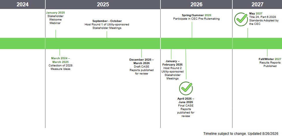 The Statewide Codes and Standards Enhancement (CASE) Team periodically distributes email notifications that promote upcoming meetings, provide materials from past meetings, and update stakeholders on the progression of the California Energy Commission (CEC)’s rulemaking process. You can choose to receive measure-specific and/or general updates on these topics depending on your needs.